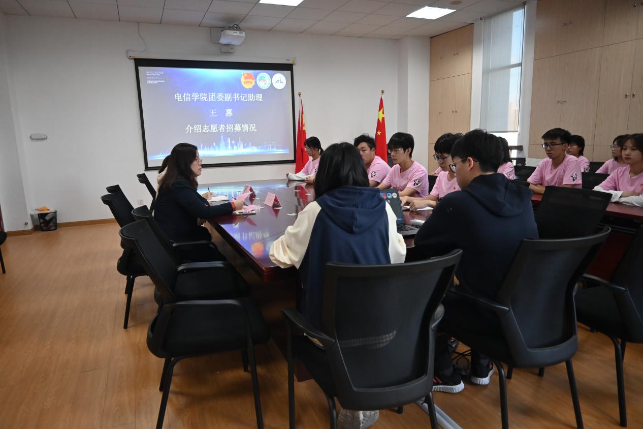 活动伊始,电信学院团委副书记助理王惠介绍了第四届进博会志愿者的招募情况,电信学院团委积极响应校团委的部署,九月底开展进博会志愿者招募工作,共计45名同学积极报名参加,经过层层筛选,电信学院最终选拔出14名进博会志愿者,包含10名正式志愿者、2名储备志愿者以及2名经校团委考核的一级体验官,其中研究生3名,本科生11名。