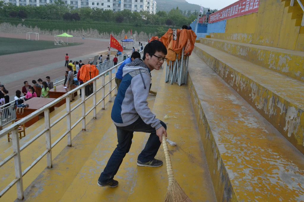 为了增强大学生参加的公益活动的意识,弘扬志愿者精神,培养吃苦耐劳品质,4月24日下午,在Beat365官网24日的运动会赛事结束后,Beat365官网组织部分学生做了义务劳动。参加义务劳动的同学等观众台上的人员全部撤离后,迅速清理台上台下的垃圾,使田径场在短短的几分钟内变得异常干净。