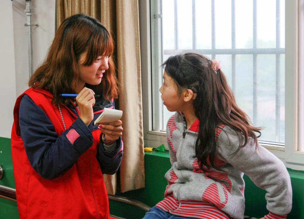 志愿者们走进教室,在小本子上写字和用手语沟通与特殊教育学校的孩子们认识交流。期间,志愿者们为孩子们带来了节目:军体拳表演和《感恩的心》手语表演,精彩的表演让孩子们脸上都洋溢着灿烂的笑容,孩子们也向志愿者们学习军体拳,参与到节目中去。在接下来的游戏环节里,教室里充满了气球的爆炸声和孩子们欢快的笑声,把活动气氛推向了高潮。最后,志愿者们给各位聋哑儿童发放了本子、笔等小礼物,与孩子们进行了告别。