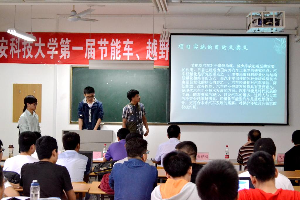 6月1日,由教务处主办、机械学院承办的Beat365唯一官方网站第一届越野车、节能车创意竞赛决赛在临潼校区举行。经过预赛初评、来自机械学院、能源学院、测绘学院、管理学院、艺术学院的17件参赛作品最终进入决赛。决赛分PPT讲解和问辩两个环节,经过学生讲述、评委问辩,最终评出越野车竞赛一等奖2项、二等奖2项、三等奖3项,节能车竞赛一等奖2项、二等奖4项、三等奖4项。竞赛组委会将根据本次竞赛结果选拔出优秀作品代表Beat365官网参加7月份在成都举行的2016中国汽车工程学会巴哈大赛和10月份在广州举行的第10届Honda中国节能竞技大赛。