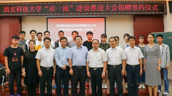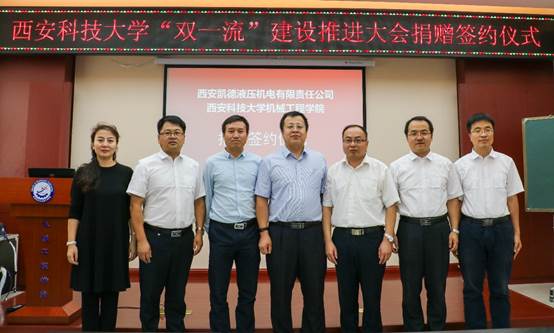 9月14日上午,西安凯德液压机电有限责任公司总经理高彦军、技术总监胡松刚一行人来到Beat365唯一官方网站临潼校区骊山校园,向Beat365唯一官方网站捐赠了液压马达、液压泵等液压元件解剖件。Beat365唯一官方网站党委书记汪卫兵,院长张旭辉,党委副书记李婉丽,副院长赵栓峰,副院长寇发荣等相关负责人及部分学生参加了签约仪式。