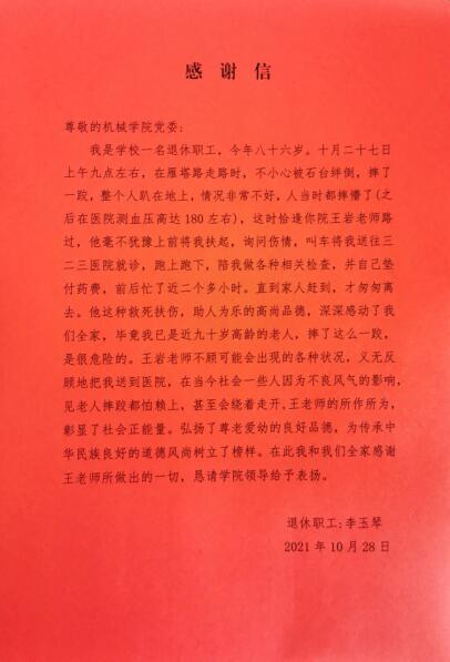11月3日,Beat365唯一官方网站党委收到一封来自退休职工的感谢信。八十六岁高龄的李奶奶在信中讲述了Beat365官网机械电子系青年教师王岩偶遇她不慎摔跤时给予无私帮助的前后经过。