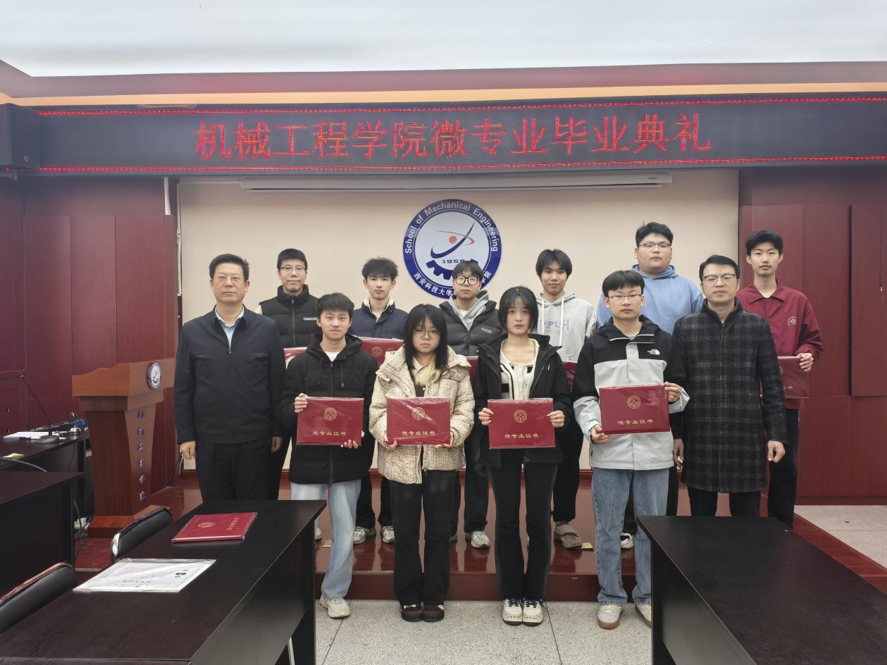 活动中,钟斌详细介绍了本年度开设的新能源汽车工程、智能车辆设计、智能化设计与制造、智能机电工程四个微专业的基本情况以及学生参与本次微专业学习的情况,本年度学院累计75人参加微专业学习,其中75顺利结业,结业率100。并阐释了微专业紧密对接国家战略新兴产业发展需求,旨在打破学科壁垒,融合机械、电子、控制和信息等多学科知识,形成了“模块化、项目化、交叉化”的人才培养特色,提升了学生的跨学科知识整合能力与工程实践创新能力,助力在校大学生未来多一种可能!随后,与会领导和微专业负责人共同为圆满完成学业的同学们颁发了结业证书。