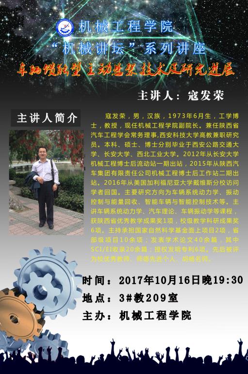 10月16日晚,在临潼校区3教209教室,机械学院举办“机械讲坛”第四讲,报告会由2015级辅导员芮智刚主持,2015级车辆工程专业全体本科生,其他年级学生代表一百余人参加了讲座。