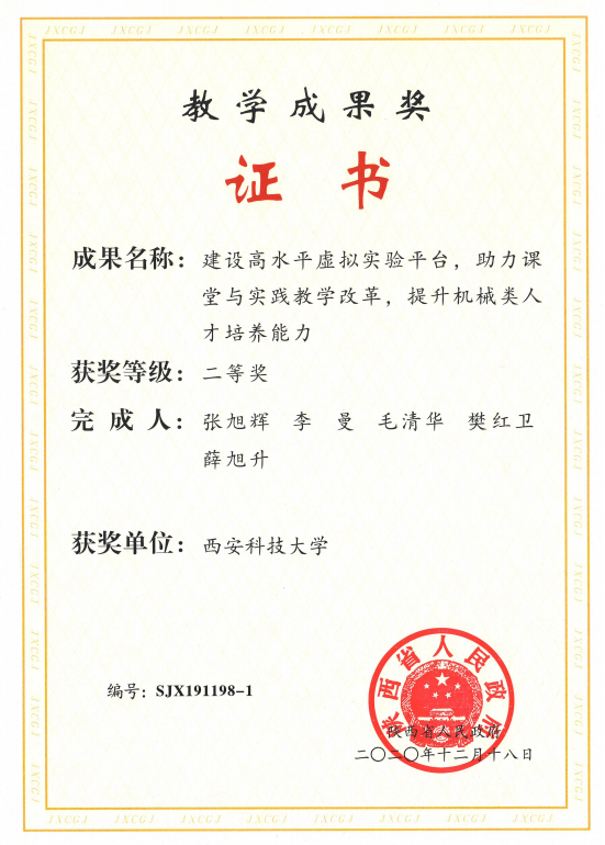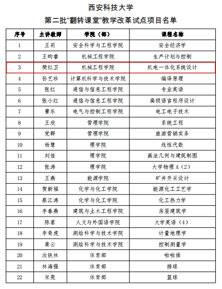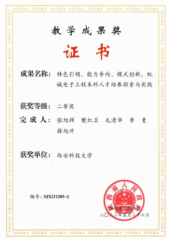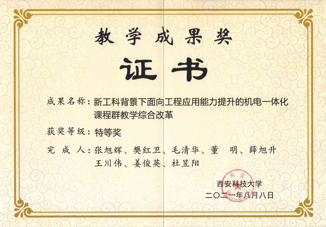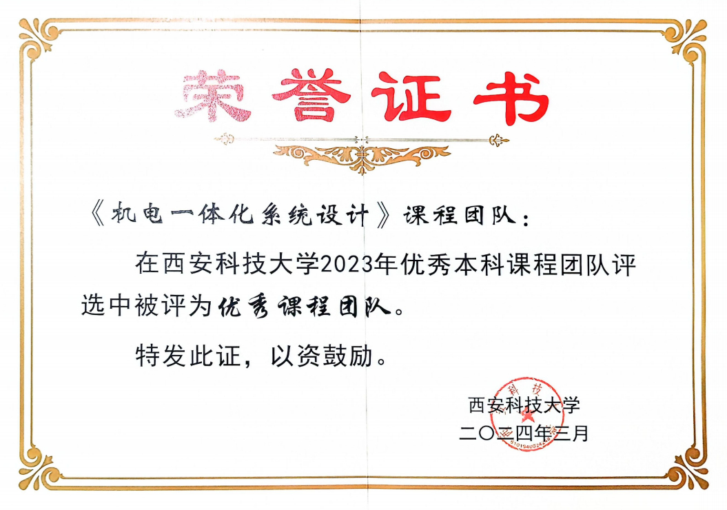 Beat365唯一官方网站《机电一体化系统设计》课程组在张旭辉教授、樊红卫副教授带领下,坚持为党育人,为国育才,立德树人根本宗旨,从教材编写到课程建设,开展了全方位的教育教学改革,入选了陕西省一流课程,支撑了机械电子工程专业入选国家级一流专业建设点。主要建设成果如下: