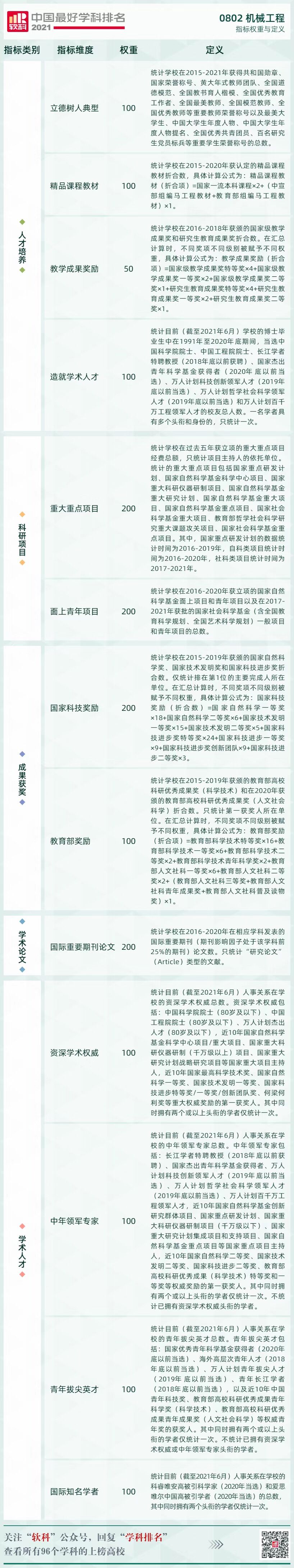 软科中国最好学科排名的指标体系包括人才培养、科研项目、成果获奖、学术论文、学术人才五个指标类别,下设17个指标维度,共计50余项反映学科竞争力的客观量化指标,涉及百余项观测变量。由于部分指标在不同学科门类的适用性和重要性存在差别,因此中国最好学科排名在不同学科采用差异化的指标体系。机械工程学科的指标权重与定义如下: