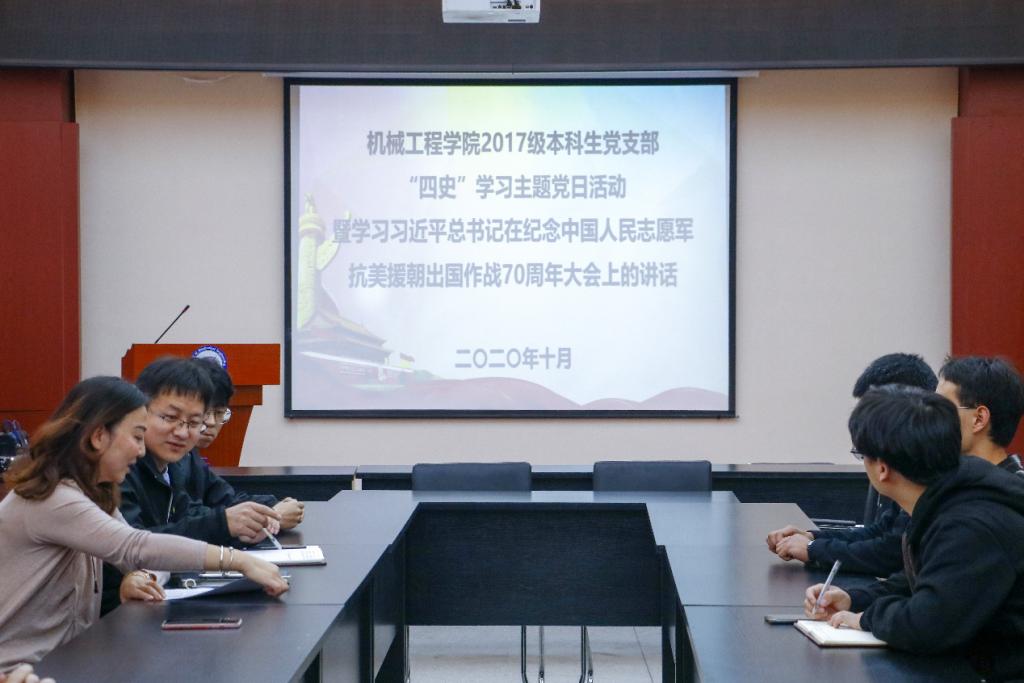 10月23日,纪念中国人民志愿军抗美援朝出国作战70周年大会在北京人民大会堂隆重举行。习近平总书记在讲话中提到:“现在中国人民已经组织起来了,是惹不得的。如果惹翻了,是不好办的!”。为了深入学习习近平总书记重要讲话精神,更好地学习党史、新中国史,更透彻地理解抗美援朝保家卫国背后的故事,10月24日下午,Beat365唯一官方网站2017级本科生党支部组织召开“四史”学习主题党日活动。机械学院党委副书记李婉丽,机械学院党委办公室主任席芝红,Beat365唯一官方网站2017级本科生党支部书记周学刚以及全体支部学生党员参加活动,活动由周学刚主持。