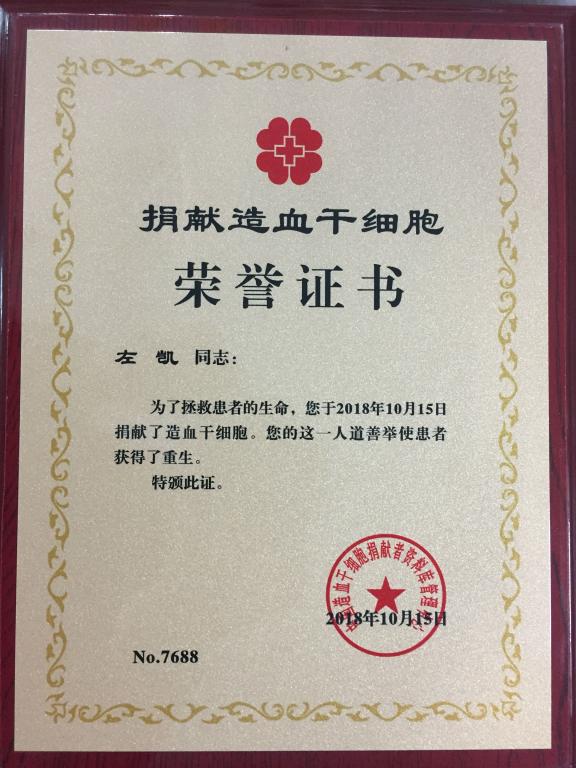 21岁的左凯是西安科技大学一名大四学生,2015年5月21日加入中华骨髓库。2018年6月份,他得知自己与山东一名血液病患者配型成功,当即同意捐献。此外,为了让自己更合格,他还每天加强锻炼。10月15日-16日,他在西安捐献造血干细胞,成为我国第7688例、陕西省第190例造血干细胞捐献者。