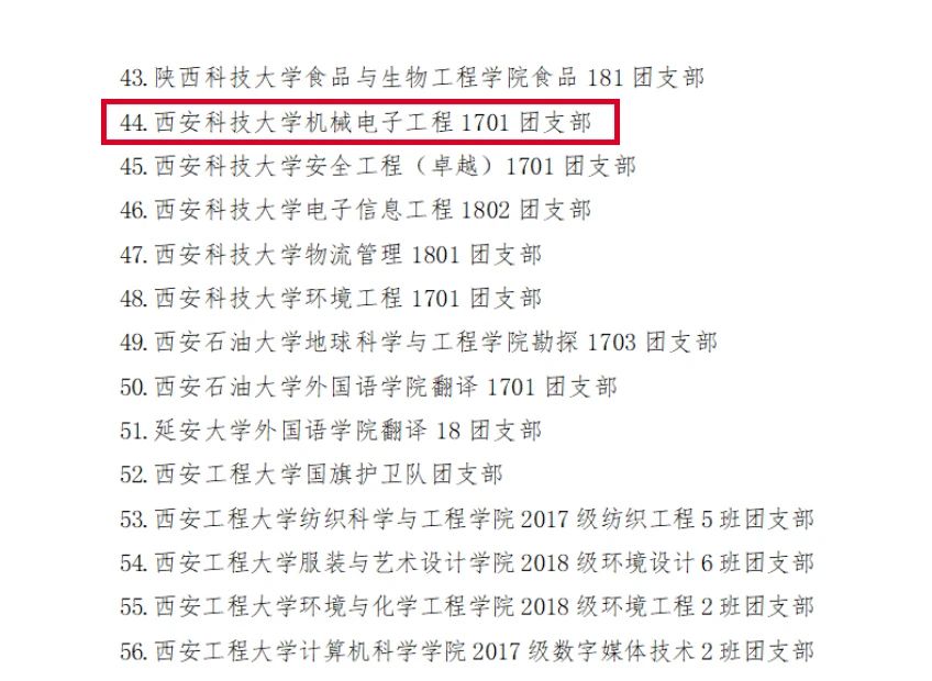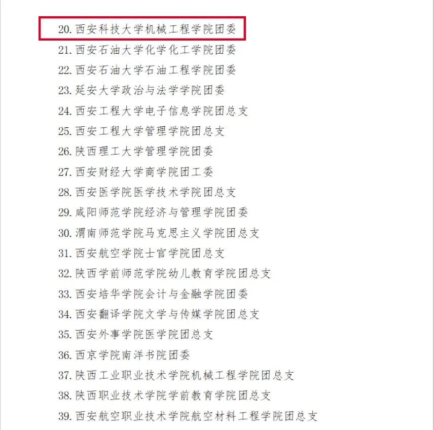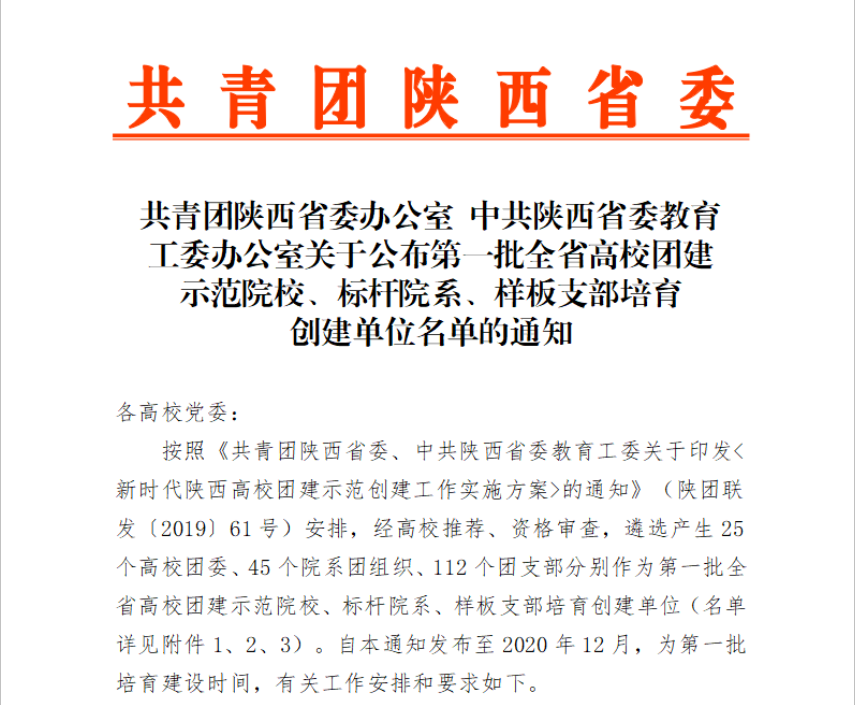 2020年5月13日,由共青团陕西省委办公室,中共陕西省委教育工委办公室公布的关于第一批全省高校团建示范院校,标杆院系,样板支部培育创建名单中,Beat365唯一官方网站团委被评为“全省高校团建标杆院系”。