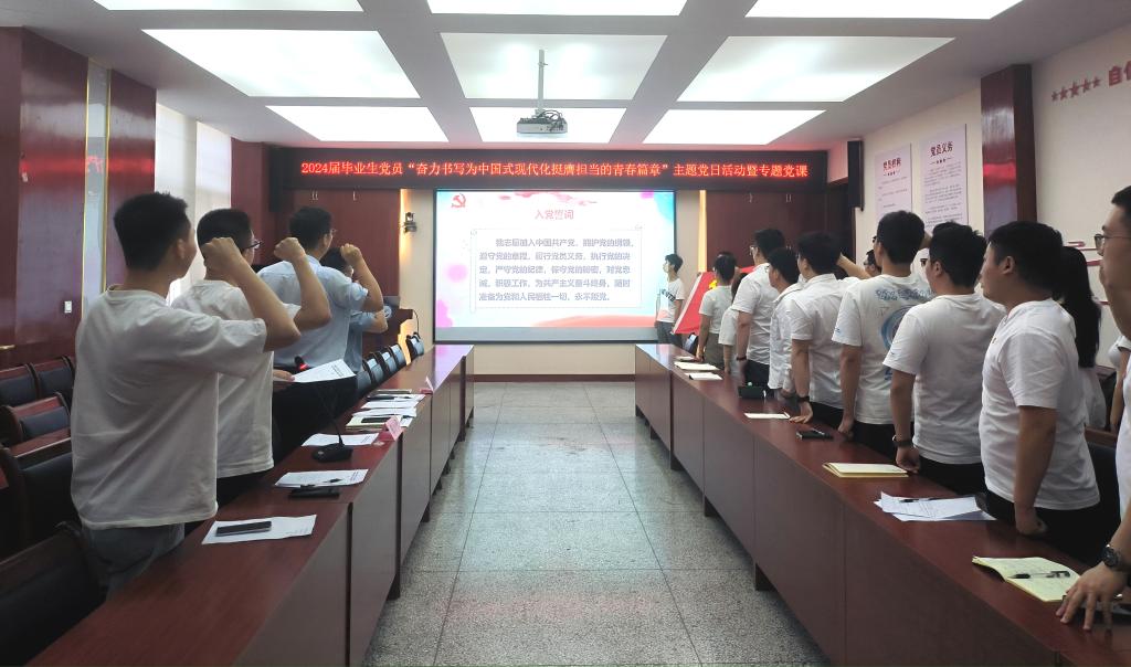 郭小平书记充分肯定了大家在校期间取得的成就,并代表学院党委向即将毕业的学生党员表示祝贺,对同学们在校期间为学校和学院发展做出的贡献表示感谢。最后,他以“守牢纪律初心、永葆党性修养,自觉做忠诚干净担当的合格党员”为题,为2024届毕业班党员讲授党纪学习教育专题党课。他围绕党纪学习教育的意义与要求,深入解读了新修订的《中国共产党纪律处分条例》的重要意义、主要内容以及贯彻执行的具体措施等。他强调,一是要严明纪律规矩,筑牢思想防线;二是要强化作风建设,激发担当作为;三是要坚守廉洁底线,争做模范先锋。他希望全体毕业生党员要牢记母校的教育和嘱托,在今后的学习和工作中牢记党员身份、强化责任担当,将遵规守纪内化于心、外化于行;要坚持学习,通过不断地学习,明是非、悟真理、守初心、担使命,争做攻坚克难的奋斗者;要时刻保持共产党员的先进性,充分发挥党员先锋模范作用,勇毅前行、笃行不怠,争做有理想、敢担当、能吃苦、肯奋斗的新时代好青年;要始终坚守爱党爱国和爱校荣校情怀,坚定不移听党话、感党恩、跟党走,心系学院建设,心系母校发展,心怀“国之大者”。