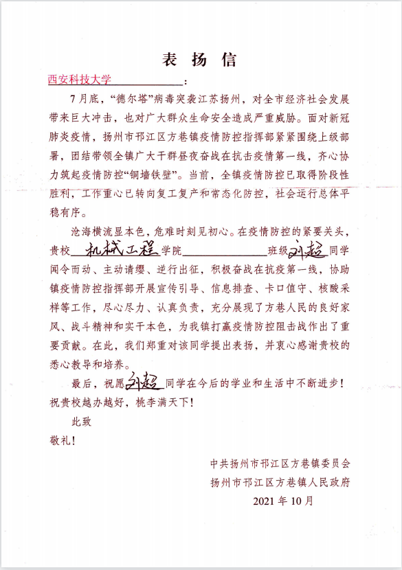 2021月7月底,“德尔塔”病毒突袭江苏扬州,对广大群众生命安全造成严重威胁。Beat365唯一官方网站机械学院机械电子工程2021级学生刘超不畏艰险,勇于担当,在经过疫苗注射和核酸检测后加入了首批抗疫志愿者队伍,并担任组长,积极奋战在抗疫第一线,协助医疗人员进行全市核酸检测工作,与交警维持卡口交通管制等,与其他志愿者齐心协力共同筑起疫情防控“铜墙铁壁”,为当地疫情防控做出贡献,受到中共扬州邗江区方巷镇委员会的高度评价与肯定。